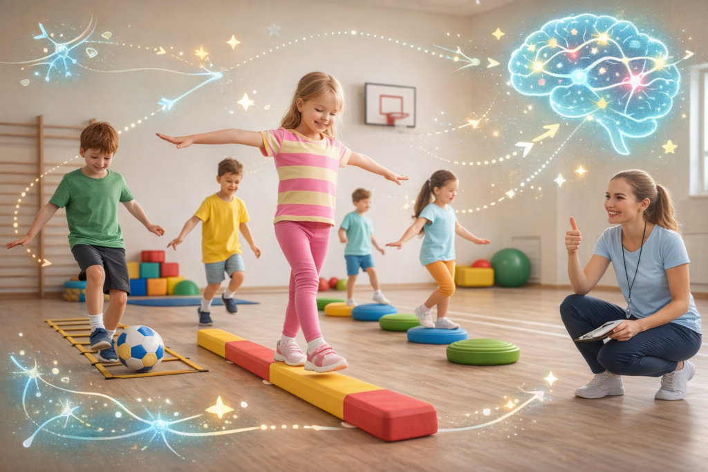 A Komplex mozgásterápia egy pedagógiai fejlesztő módszertan. Nem önálló szakma, hanem gyakorlati pedagógiai tapasztalatokra épülő pedagógiai módszer. A Komplex mozgásterápiás fejlesztés egy olyan neuropedagógiai eljárás, amely az idegrendszer plaszticitását, állandó változásra való képességét igyekszik kihasználni leginkább mozgásos, specifikus gyakorlatok segítségével. Megoldásközpontú, kevés eszközt igénylő módszer, mely segíti az iskolai helytállást, fejleszti a figyelmet, támogatja a logopédiai fejlődést és még a beilleszkedési nehézségek leküzdésében is segít. Tapasztalatok szerint a Komplex mozgásterápia fejlesztő módszertanának szakszerű alkalmazása segítséget nyújthat a gyermekek kézügyességének, finommotorikájának fejlesztésében. Szerepe lehet a feladattudat, az együttműködési készség, az önbizalom, a kompetencia érzés, a testtudatosság, a figyelem fejlesztésében és a beszédészlelés, auditív megkülönböztető készség megalapozásában. A nagylétszámú csoportos (osztályok) fejlesztő folyamat általában 2-3 tanévet vesz igénybe. egy héten minimum négy, maximum 5 különböző napon kell gyakorolni az optimális hatékonysághoz. Terveink szerint a testnevelést oktató tanárok a csoportos KMT tanfolyam elvégzése után a technikát beépítik majd a mindennapi testnevelés órákba. A gyermekek a megtanult gyakorlatokat akár otthon is végezheti egyedül vagy szülői felügyelet mellett.