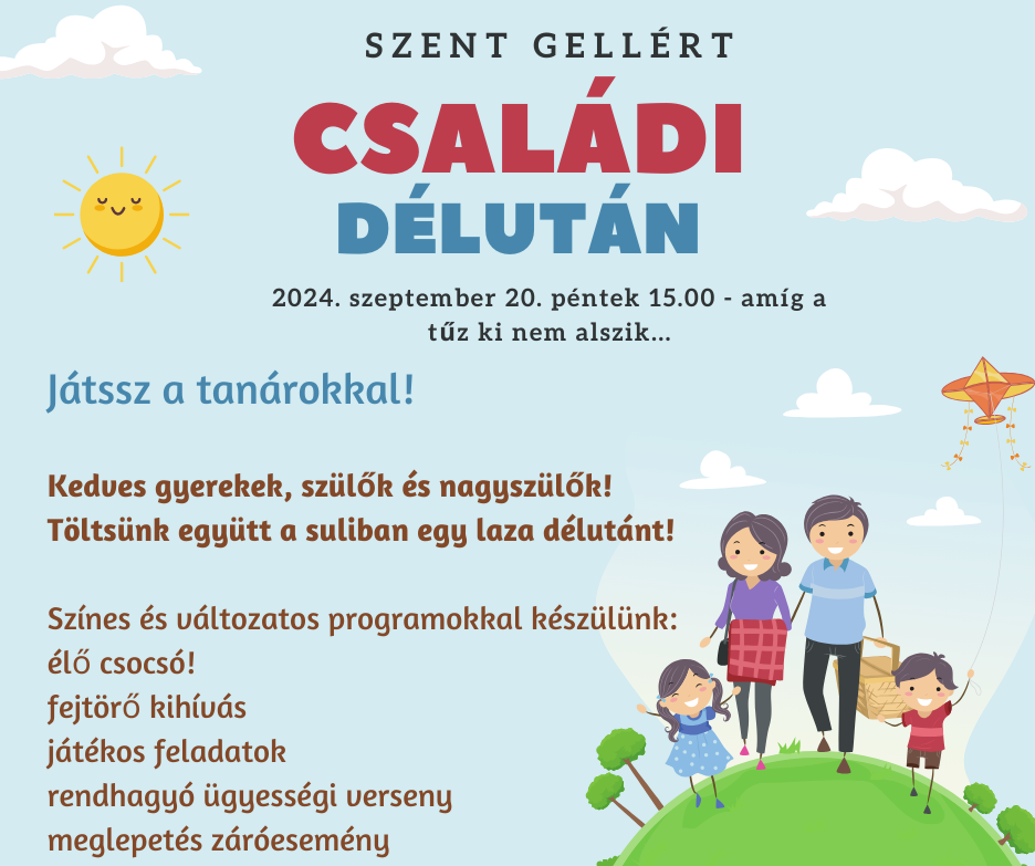 Szeretettel várjuk a gyerekeket, szülőket és nagyszülőket egy vidám, közös délutánra a Szent Gellért Általános Iskola udvarán!