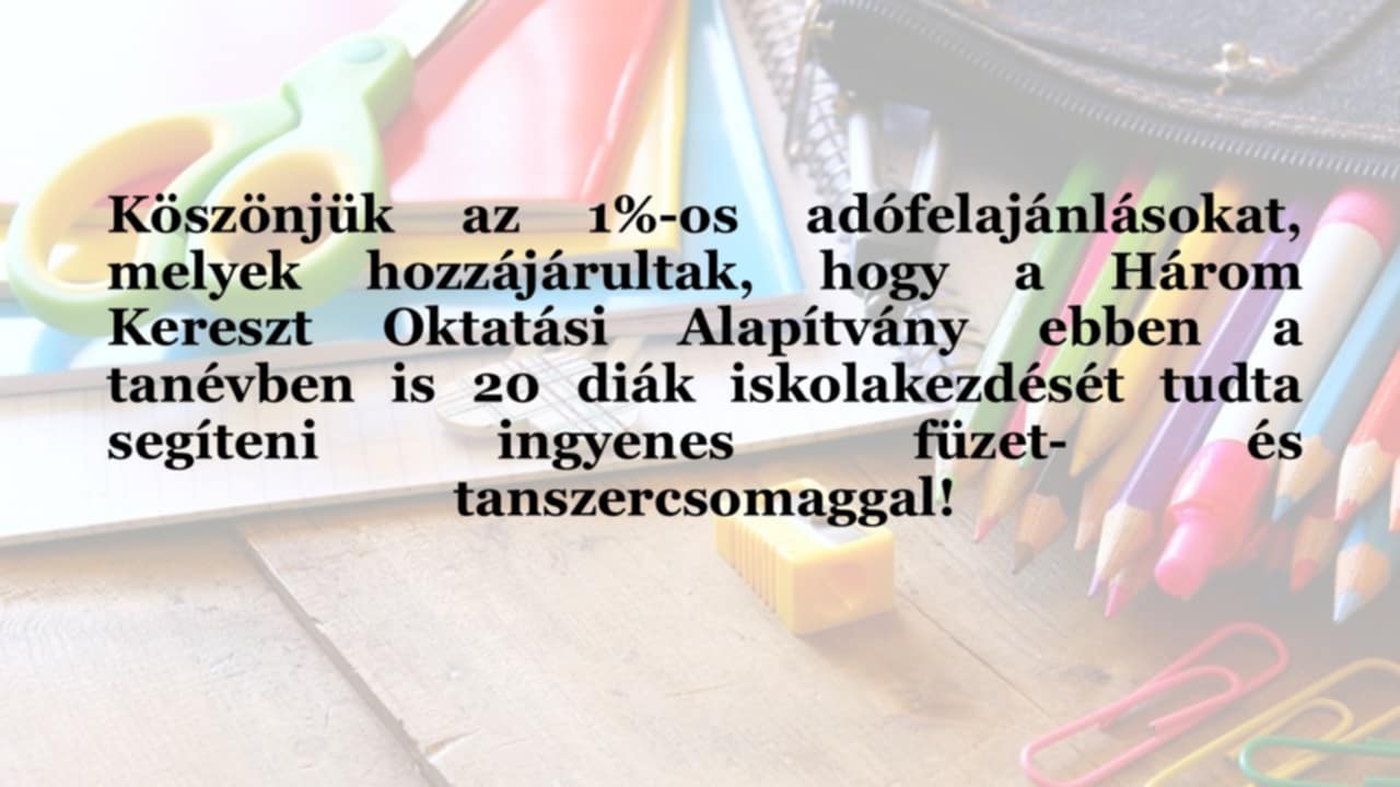 A Károm Kereszt Oktatási Alapítvány hálásan köszöni mindazoknak, akik adójuk 1%-ával hozzájárultak munkánkhoz. Az Önök nagylelkű támogatásának köszönhetően ebben a tanévben 20 rászoruló diák iskolakezdését tudtuk segíteni – teljesen ingyenes füzet- és tanszercsomaggal. Egy apró gesztus – egy nagy lehetőség. Köszönjük, hogy velünk együtt hisznek a jövőben!
